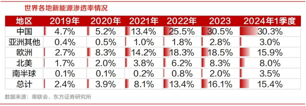 增量二:中系新能源出海欧美以外的地区。在当地政策激励下,东南亚、拉丁美洲、大洋洲等地区新能源渗透率有迅速提升的趋势,中系新能源车在性价比和智能化方面表现突出,往往能在新能源市场获得极高份额。
