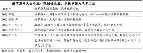 1、俄罗斯:增量有限,出海方式多样化俄罗斯政府对国内汽车工业保护意识较强。长期以来,俄罗斯对进口车辆征收较高关税,甚至对散件进口组装的方式也较为排斥。2023至2024年,在西方车企撤出、中系进口汽车快速增长的背景下,俄罗斯接连出台进口限制性政策。