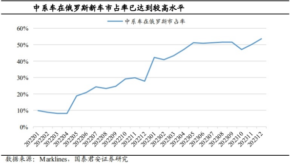 中系车在俄罗斯市占率提升空间有限,增长动力来源于全市场总量恢复。2023年中系车在俄市占率已达50%左右,来自政策端的阻力逐渐显现,未来市占率进一步提升的空间有限,但或可受益于俄罗斯汽车市场总量增长。俄罗斯汽车市场连续受战争、制裁影响,总销量由2013年的277万辆下滑至2023年94万辆,未来如果俄罗斯经济恢复,汽车市场也有望实现增长。