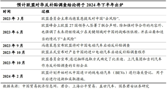 预计西欧对华电动车反补贴调查结论将于2024年下半年出炉。2023年10月欧盟正式宣布启动反补贴调查程序。反补贴调查的程序主要包含立案、涉案产品范围评论、抽样决定评论、立案评论、公共利益评论、初裁信息提交、初裁决定,初裁听证、终裁征税等,最大调查时长为13个月。