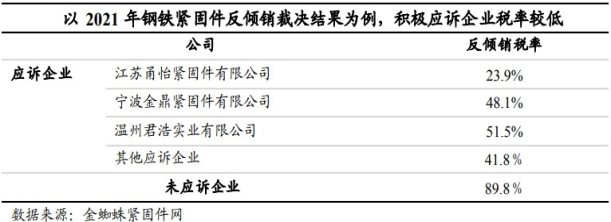 企业积极应诉有望获得优惠条件。“双反”调查一般以加征关税为惩罚性措施。欧盟“双反”调查中为鼓励企业配合调查,不应诉企业的最终税率通常会远高于合作的应诉企业。在欧盟对华钢铁紧固件反倾销调查事件中,未应诉企业反倾销税率高达89.8%,应诉企业的税率最低仅为23.9%。虽然中国整车企业尚无应对“双反”调查的案例,但轮胎等汽车零部件行业的相关经验丰富。企业如能协调各方资源积极应诉,有望获得优惠税率。