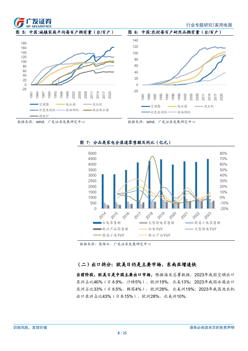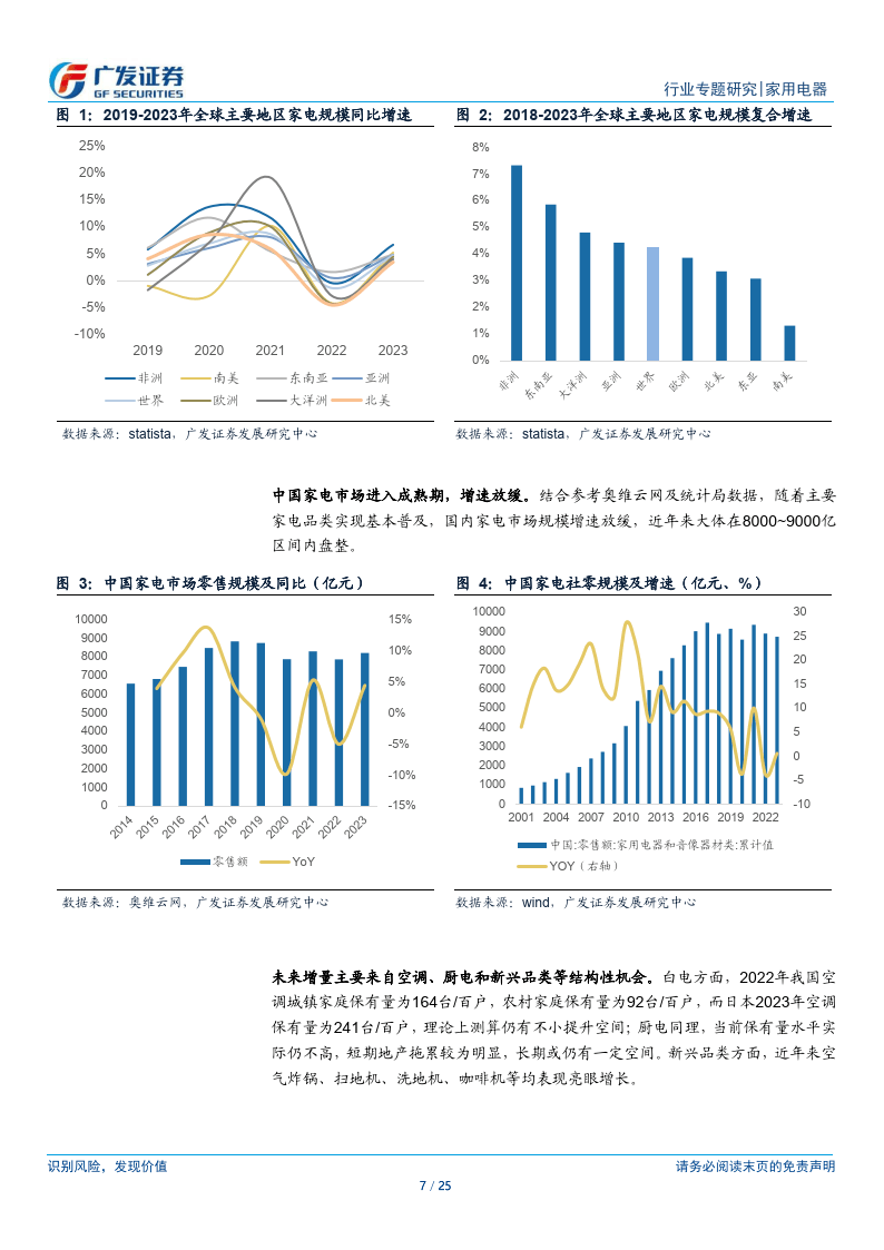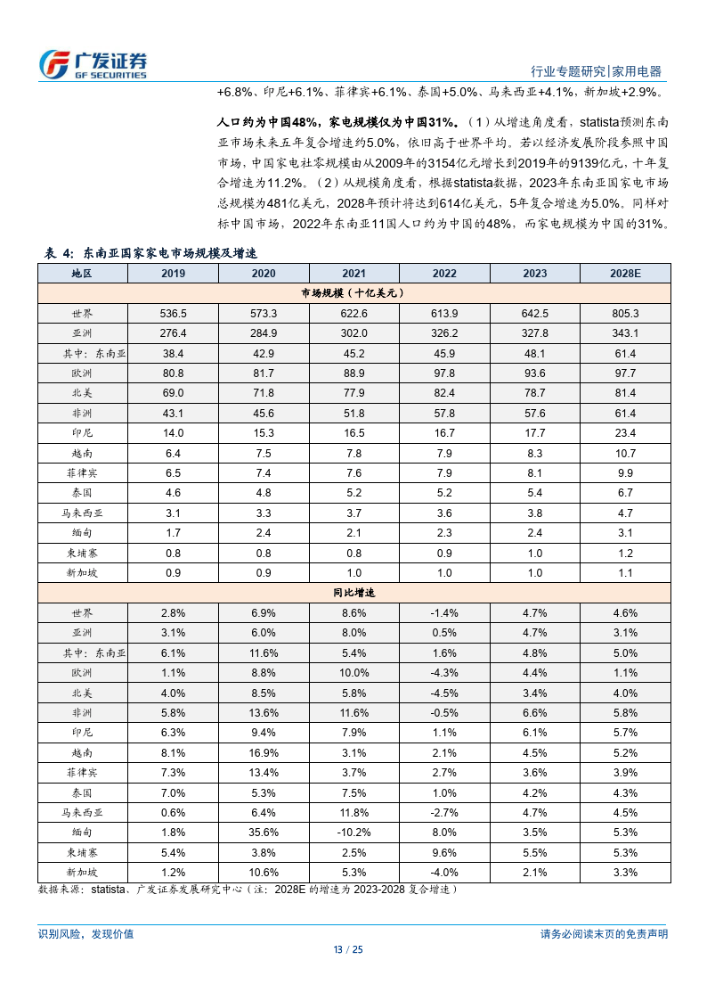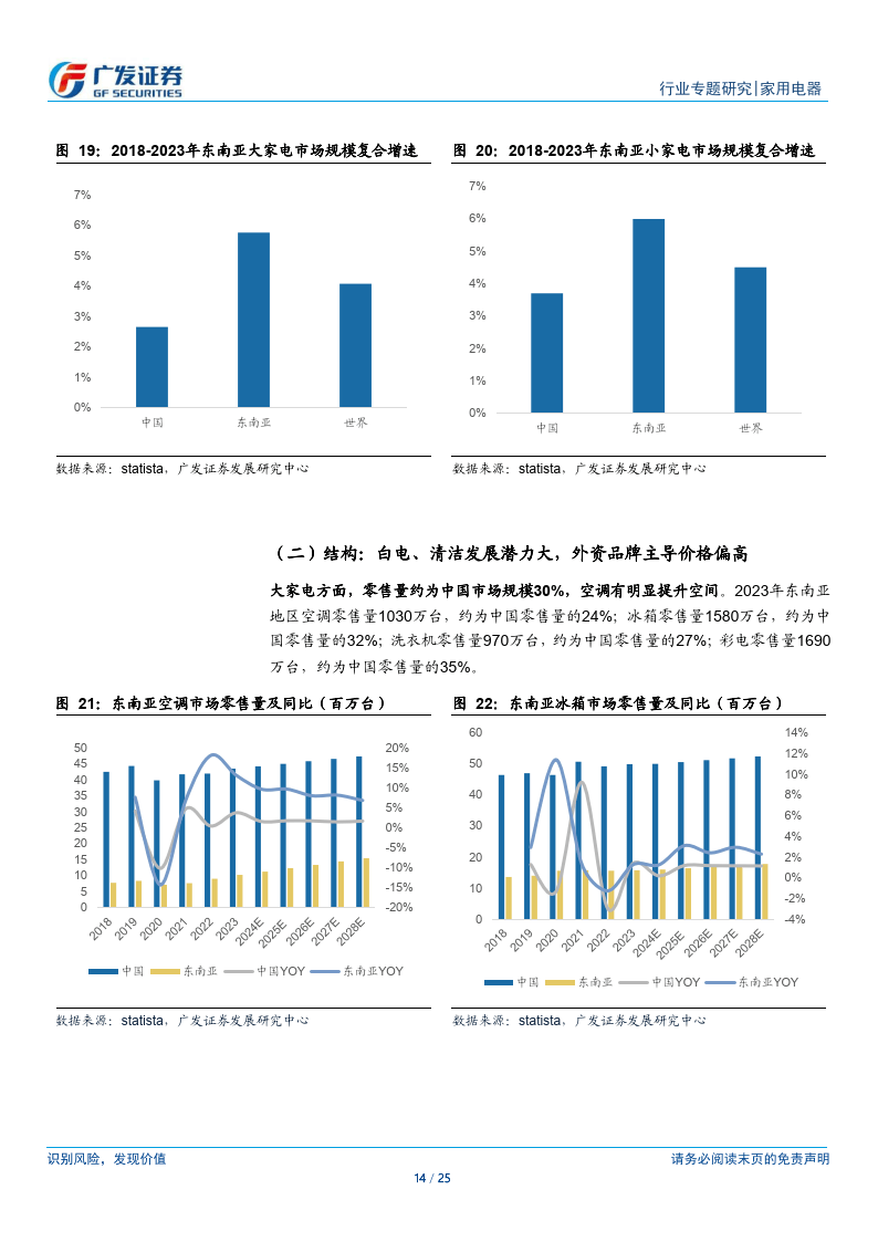 从销量角度看,根据 statista 数据2023 年空、冰、洗、彩电、厨小电、清洁电器、个护类市场规模分别为中国市场规模24%、32%、27%、35%.31%、24%、30%。考虑当地气候条件及生活习惯,我们认为空调、清洁电器均具备较强发展潜力。