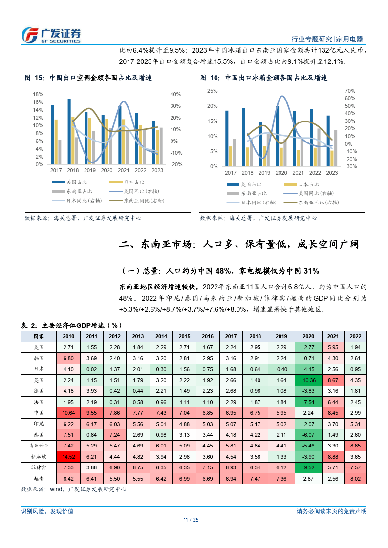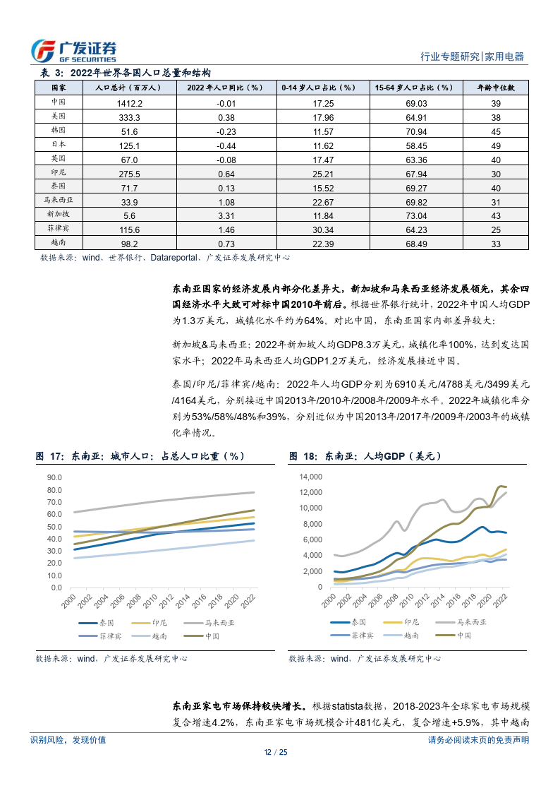 根据世界银行数据,2022 年东南亚 11 国人口合计 6.8 亿人,约为中国人口的 48%: 根据 tatista 数据,家电市场规模约为 481 亿美元,仅为中国的 31%。