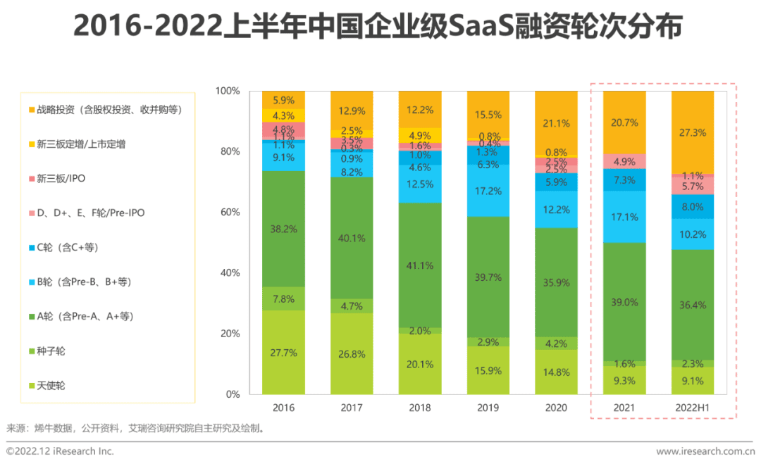 相比2016年,2022年上半年的股权投资、收并购等战略投资比重增加了21.4个百分点,而天使轮与种子轮占比下降了18.6个百分点,可见中国企业级SaaS市场走向成熟的同时,资本市场对“概念热度”的态度更加理性,目光分别向产品初具形态的厂商及商业路径相对成熟的厂商侧倾斜。就2021年和2022年上半年融资结构上看,商业模式成熟的业务垂直型SaaS更受关注,而产品成型、潜力较大的行业垂直型SaaS更受青睐,但整体没有呈现太大差异。