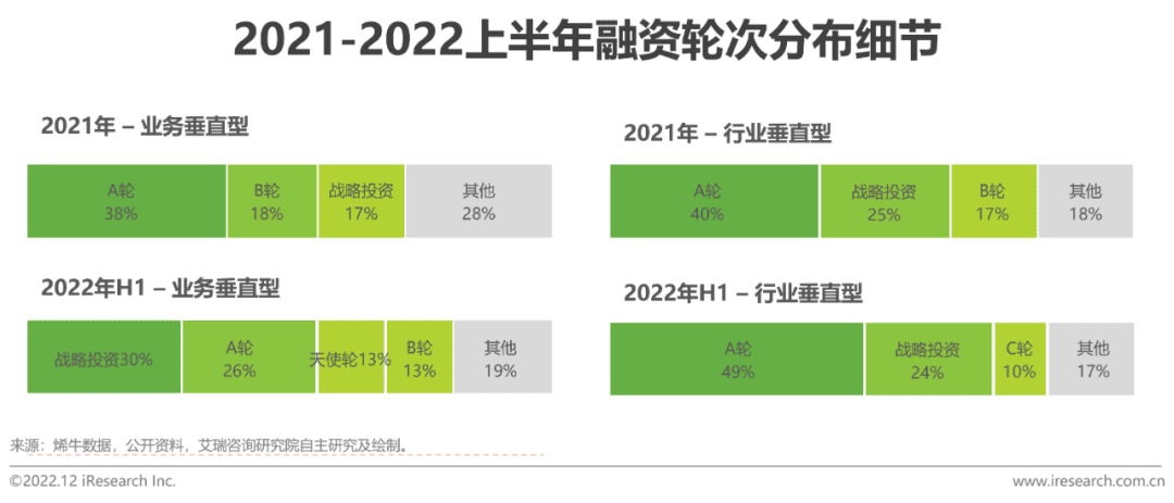 Compared with 2016, in the first half of 2022, the proportion of strategic investment such as equity investment, revenue merger and acquisition increased by 21.4 percentage points. While the proportion of angel round and seed round decreased by 18.6 percentage points. It can be seen that while China’s enterprise SaaS market is becoming mature. The capital market has a more rational attitude towards “concept heat”. The eye is tilted to the manufacturers whose products are taking shape and the relatively mature commercial path. In terms of financing structure in 2021 and the first half of 2022, business vertical SaaS with mature business model attracts more attention, while vertical SaaS in industries with formed products and greater potential is favored, but the overall difference is not too great.