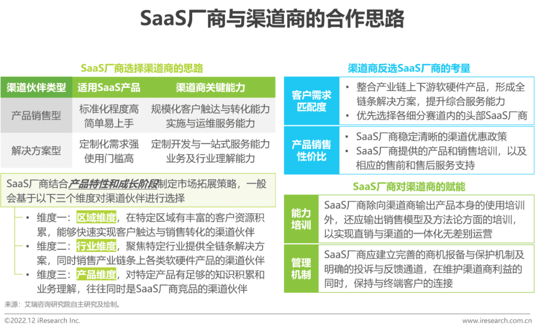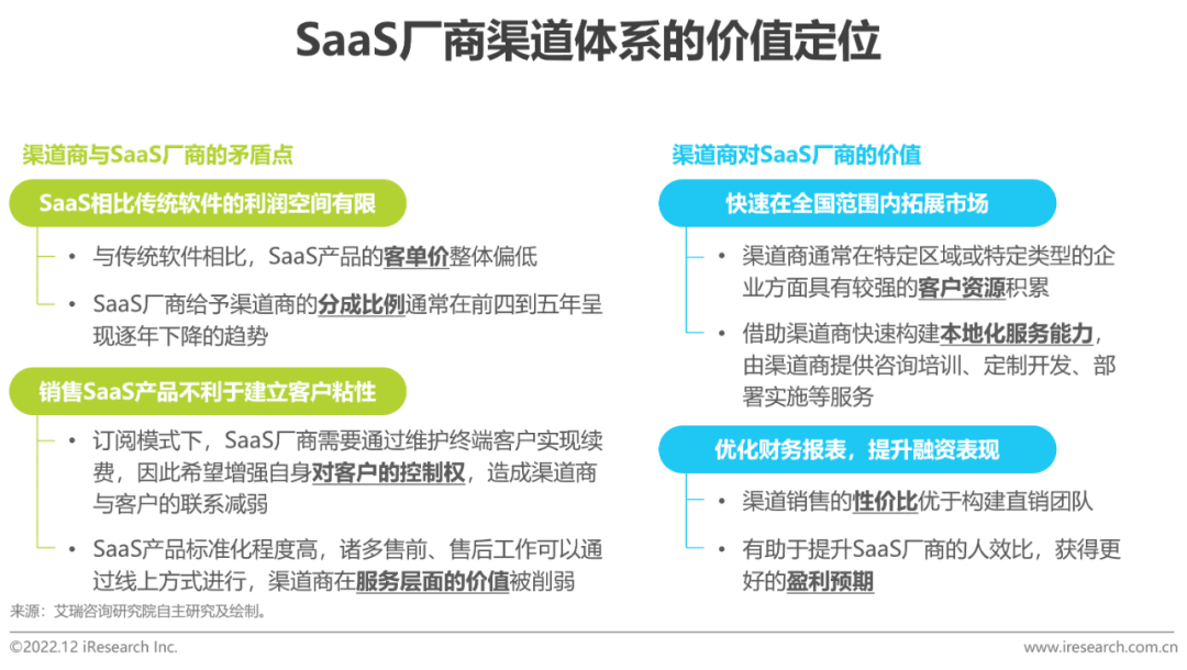 而随着中国SaaS市场规模的快速增长,渠道商为维持自身竞争力,开始从传统软件转向SaaS销售。同时SaaS行业步入买方市场,规模化扩张与销售转化的价值被放大,渠道商快速拓展市场的能力凸显。SaaS厂商与渠道商的关系趋于缓和,双方逐步合作探索SaaS时代下的渠道销售模式。