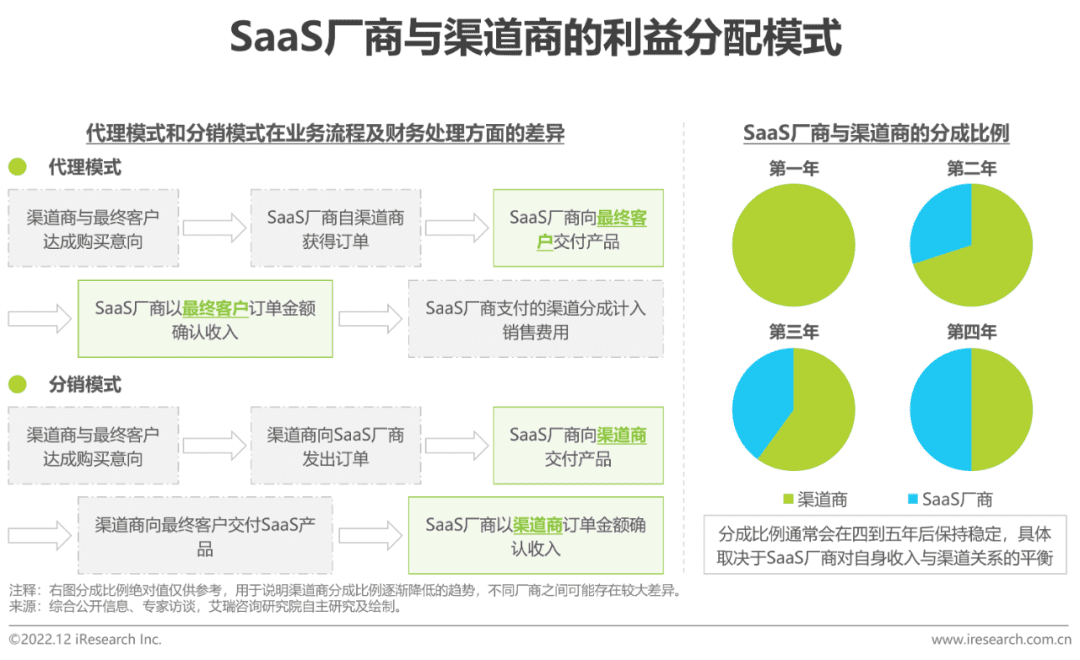 渠道销售存在代理和分销两种模式。在代理模式下,SaaS厂商对终端客户有较强的主导权,以最终客户订单金额确认收入,渠道分成计入销售费用;而分销模式赋予了渠道商更大的自主性,SaaS厂商向渠道商交付产品,并以渠道商的订单金额确认收入。由于渠道商在前期的拓客中投入较多精力,通常SaaS厂商会在产品销售的前几年给予渠道商更多的分成,以激励渠道商,随着时间的推移,渠道商收获的分成比例将会逐步降低,后期基本稳定在50%左右。