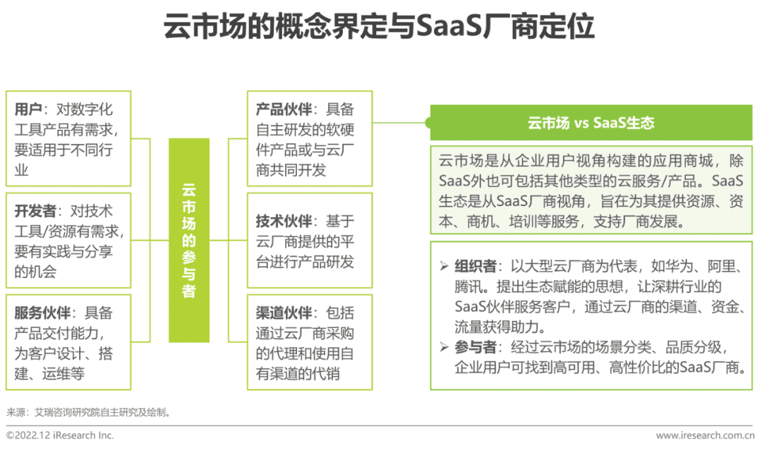云市场本身是由大型云厂商搭建的聚焦于服务企业客户的第三方软件与服务交易平台,通过连接用户、开发者、产品、技术、服务、渠道等不同伙伴,聚合云领域的产品与服务,包括云主机资源、运行环境、产品应用等板块。云市场生态中,SaaS厂商多作为产品伙伴,而云市场类似于综合应用商店,涵盖了适用于各垂直场景、各行业场景的SaaS应用,企业用户可以一站式选购并快速使用。目前,诸多互联网大厂均在积极布局云市场建设,试图打造更加一站式的综合数字化平台。