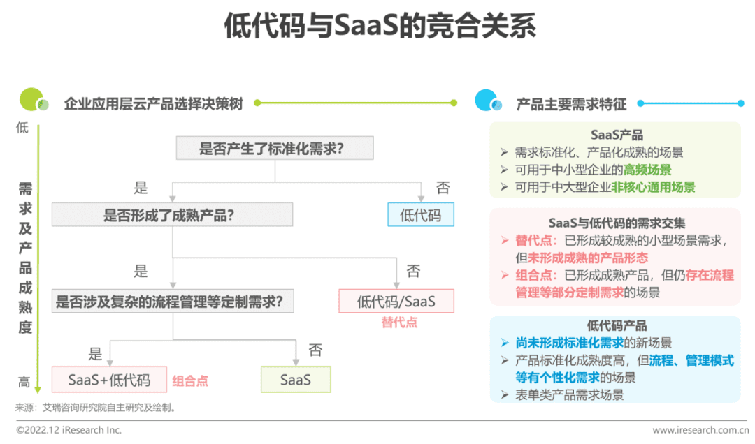 Under different requirements and product maturity environments, enterprises will have a preference for SaaS and low code, and a small amount of intersection between the two can be classified into the following two scenarios: (1) When scenario requirements are standardized but mature products have not been formed, there is a substitution relationship: Due to the lag in product development, there is a time gap between demand formation and product maturity.