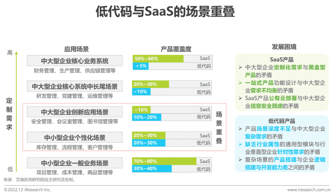 Up to now, SaaS and low-code products have permeated all business scenarios of large, small and medium enterprises, resulting in the “competition illusion” of substitution relationship between them to a certain extent. Among them, the characteristics of SaaS products are as follows: (1) The development of general scenarios and industrial vertical scenarios is fast, while the development of scenarios with high degree of personalization, low frequency of use and high innovation is slow; (2) The degree of standardization is too high, which is difficult to adapt to the complex application scenarios of medium and large enterprises.