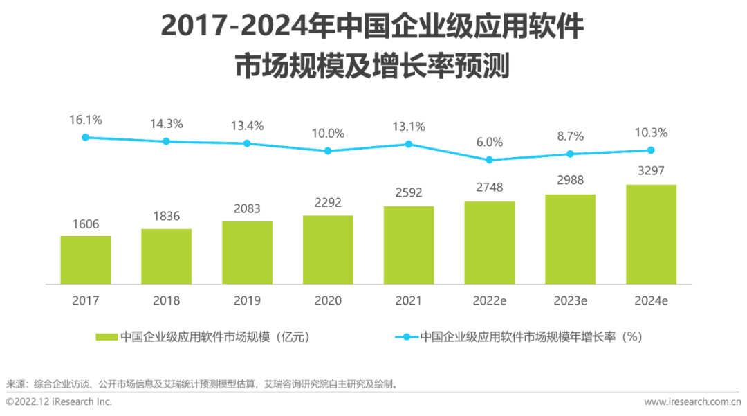 In 2021, the scale of China’s enterprise SaaS market is 72.8 billion yuan, the year-on-year growth rate decreased from 48.7% in 2020 to 35.2%. Compared with the optimistic expectation at the beginning of the outbreak of the epidemic, it is believed that the macroeconomic downturn has brought greater pressure, and the contraction of the total demand for enterprise SaaS will lead to a sharp decline in the industry growth rate. It is estimated that in 2022, For the first time, growth in the SaaS industry will fall below 10%. In the next three years, the growth of SaaS industry will also be linked to the speed of macroeconomic recovery. Under the neutral expectation, the scale of China’s enterprise SaaS market is expected to reach 120.1 billion yuan by 2024, with a compound annual growth rate of 18.1% from 2021 to 2024.