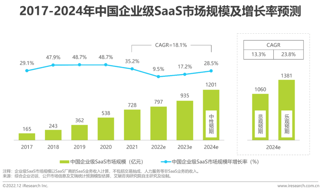 According to iResearch, China’s enterprise-level SaaS market scale reached 72.8 billion yuan in 2021. With a year-on-year growth rate of 35.2%, down from 48.7% in 2020. Unlike at the beginning of the pandemic, which benefited from telecommuting. The impact of the macroeconomic downturn and aggregate demand contraction is gradually spreading to the SaaS industry. In 2022, growth in the SaaS industry is expected to dip below 10% for the first time. In the next three years, the growth of SaaS industry will also be linked to the speed of macroeconomic recovery. Under the neutral expectation, the scale of China’s enterprise SaaS market is expected to reach 120.1 billion yuan by 2024. With a compound annual growth rate of 18.1% from 2021 to 2024.