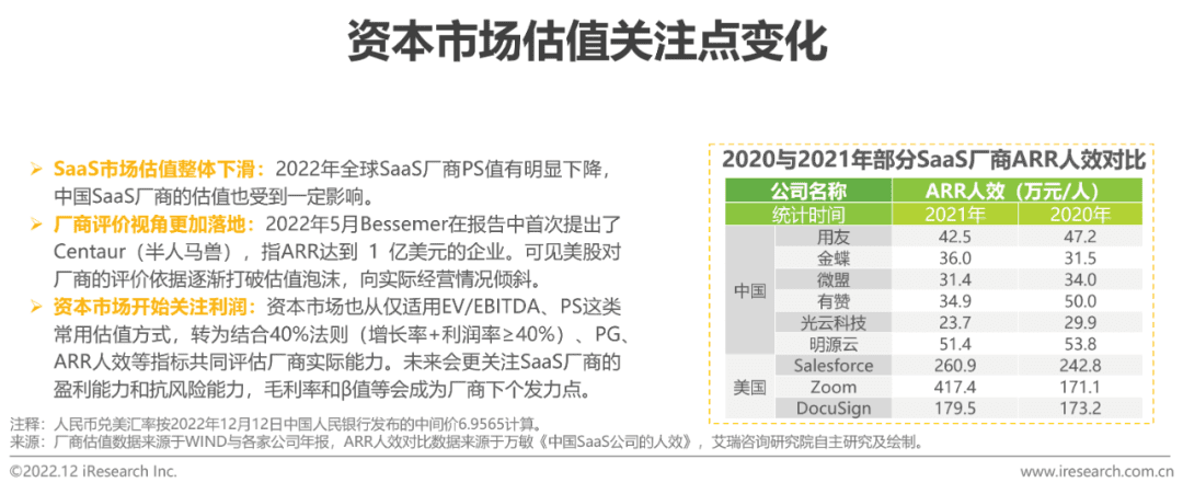 美国是全球SaaS发展最成熟的市场,上市厂商数量、SaaS化程度与覆盖场景数量都处于绝对领先地位。但在过去一年,其SaaS市场却出现了负增长,BVP新兴云指数为-50.9%,缩水程度远高于大盘。对比来看, SaaS公司的估值倍数已经降到了低于大部分历史水平的程度:比5年平均水平的12.9倍低32%,相比10年平均水平的9.4倍也低了7%。这意味着一些SaaS厂商过去“低利率、快扩张”的打法目前受到强烈挑战,而国内的SaaS厂商亦同样受到波及。