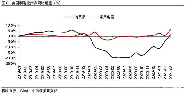 海外开工率不足,家电库存处低位。受疫情影响,海外家电企业部分停产,美国失业 人口数攀升。根据美国商务部数据,2020 年起美国家用电器库存同比增速连续 14 个月下 滑,直到 2021 年 3 月才转正,但相较 2019 年同期仍有较大差距,家电库存下滑程度大 于整体消费品行业。数字化转型网www.szhzxw.cn