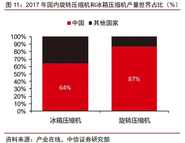 核心零部件配套完善,优先供应难以被突破。产业链一体化可带来核心零部件优先供 应权以及有效成本控制优势,中国龙头企业具备高效供应链优势。以空调为例,格力、美 的压缩机产能合计占比超过 2/3,控制生产成本的同时,从根源上基本限制了其他品牌的 产销量爆发。压缩机行业已完成行业整合,具备一定技术壁垒,同时行业毛利率和净利率 水平已处于较低水平,如海立净利率仅 3%,压缩机新进入者难以快速扩产并实现盈利。
