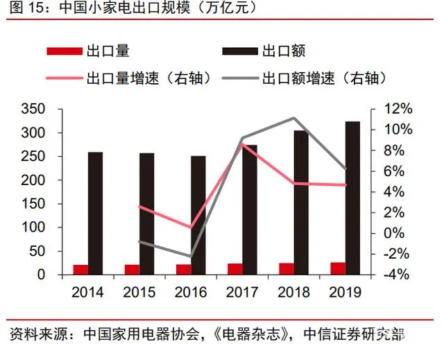 家电产能全球领先。伴随着供应链体系完善以及生产自动化的逐步推进,家电制造的 规模优势开始显现,我国已在全球家电产业链中扮演不可或缺的角色,根据欧睿数据,2020 年空调/冰箱/洗衣机生产分别占全球的 72%/47%/38%。此外,全球近 80%的小家电产能 在中国,近年来小家电出口持续增长。以美国为例,2018 年小家电产品中从中国进口的 比例达到 60%。在我国生产和研发持续进步的趋势下,中国家电产品在海外的美誉度提升, 为国内企业从“出口创汇”迈向“出口创牌”奠定了基础。