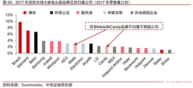 优质标的稀缺。对于收购而言,不仅需要被收购企业具有当地品牌力、渠道、产能等 配套资源,还需要股东有出售意向。以西欧为例,由于市场成熟、地域分散、本地品牌粘 性大等原因,收购是进入西欧市场的捷径。但惠而浦、伊莱克斯等全球家电龙头自 1990s 便在全球范围内收购优质标的,表现较好的品牌大多已被跨国企业收归囊中,2017 年仅 有 Miele 和 Candy 品牌仍可获取,Candy 后被海尔收购,优质标的极为稀缺。