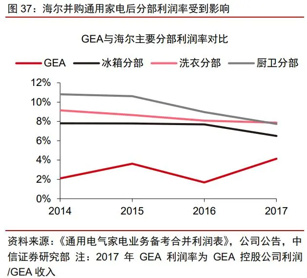 并购企业经营不善,并表拉低海尔利润水平。收购的企业普遍存在经营问题,即便是 相对优质的 GEA,也因为管理体制僵化、通用电气集团投入不足等问题,使得家电业务效 率低下,盈利能力较弱,拉低了整体公司的利润率水平。具体而言,虽然 GEA 贡献了可 观的收入增长,但收购前公司利润率约为 3%,成为公司盈利的拖累项。