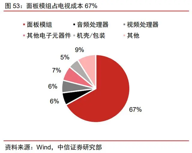 面板是电视最核心零部件,决定了电视厂商优势。面板模组是电视最核心部件,视价格结构快来看,面板模组占到 60%以上成本。面板决定了亮度、色域、对比度、分辨 率等性能,直接影响了液晶显示质量,因此面板技术上的优势决定了下游电视厂商全球地 位。面板显示行业前期投入大、投资周期长。当下游需求大,面板厂商往往投入巨额资金 扩大产能,形成一定优势周期。产能大量释放后,市场供大于求,又造成面板价格下跌。 从历史复盘来看,大体可以划分为日本阶段、韩国阶段和中国阶段。