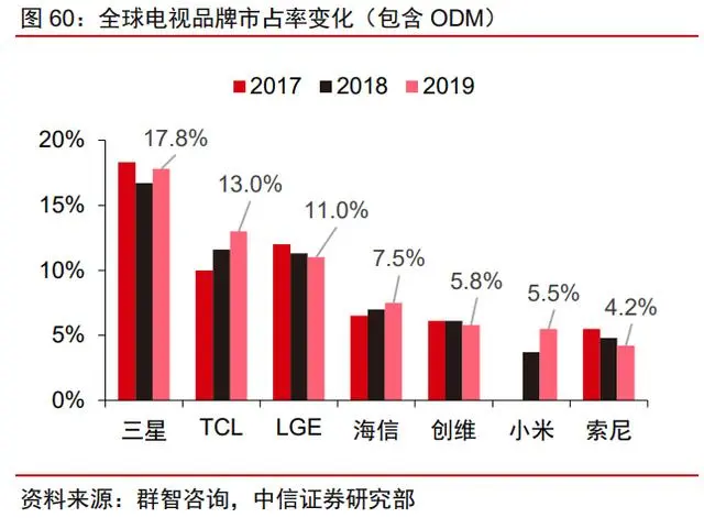 国内电视厂商加速出海。随着电视产业链转移,国内电视厂商经营效率高、生产成本 低,优势逐步体现。2020 年前三季度全球出货量前十大品牌中,国内电视厂商基本实现 市占正增长,TCL、海信、小米位列全球电视出货量的 3-5 名,仅次于三星和 LGE。其中 TCL 市占率 10%,同比增长 0.9 pct,是市占率最高的国内电视厂商。