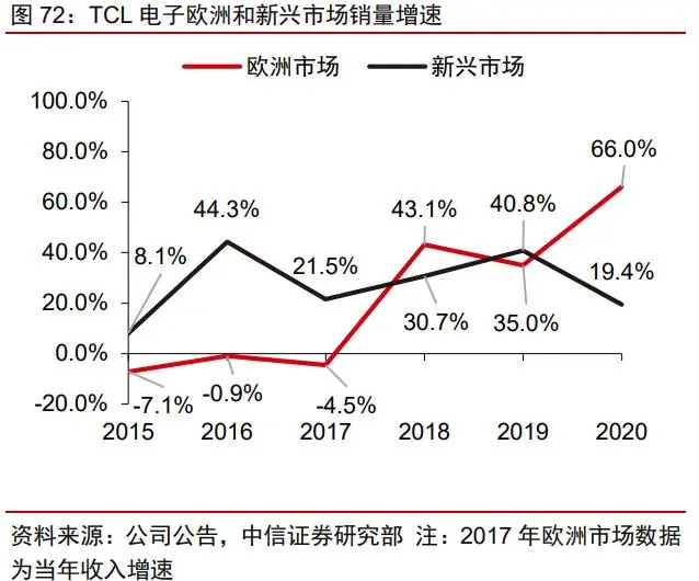 TCL 海外扬帆,份额全球领先。在家电行业中,黑电企业的出海较为成功,其中 TCL 电子是表现最好的黑电企业之一。在基本不依赖并购的前提下,自主品牌外销增速长期在 25%以上。2016 年开始北美电视销量高增长,2018 年欧洲市场重回高增长,新兴市场销 量增速从 2017 年 22%提高至 2019 年的 41%(2020 年疫情影响下,仍有 19.4%增速)。 从结果来看,2016-2020 年全球销量稳居前三,2020Q2 首次位列第二。我们认为面板一 体化供应链、与海外 OTT 运营商的成功合作是 TCL 顺利出海的主要原因,同时渠道和全 球产能布局进一步扩大了公司的竞争优势。