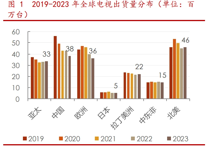 黑电海外市场占比超 80%,新兴市场占据半壁江山。2023 年,全球黑电 TV 市 场的总出货量约 2 亿台。结构上,欧美日发达地区和亚非拉等地区销量分别占比约 50%;增速上,根据奥维睿沃,最近 5 年,拉美、中东非表现出较强增长韧性, 2019-23 年亚太、中国、欧洲、日本、拉丁美洲、中东非和北美出货量 CAGR 分别 约为-3%、-9%、-5%、-2%、-1%、0%、0%。 均价上,西欧、日本市场高于全球均值。根据 IHS 数据,2018 年西欧、日本电 视平均尺寸超过 40 寸,其均价超过 600 美元,北美、东欧、亚太和拉美约与行业均 价齐平,中国、中东&非洲低于全球均价。根据中怡康数据,2018 年-2022 年 H1 全 球电视均价基本稳定在 500 元美元左右。数字化转型网www.szhzxw.cn