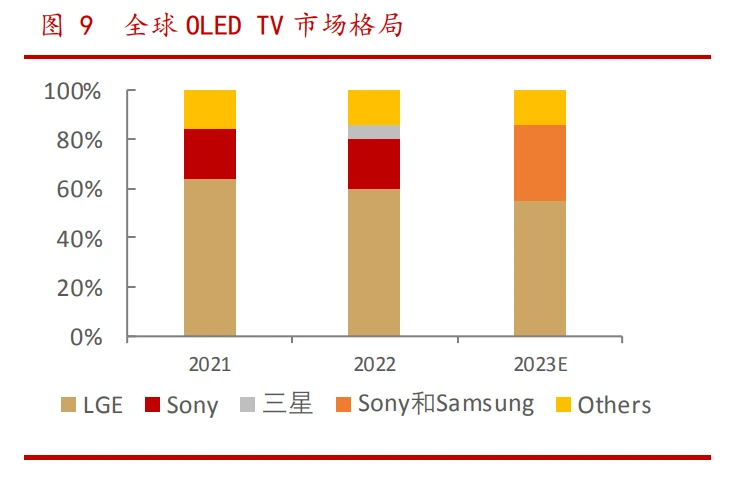 格局上,OLED 产品为日韩品牌主导,Min-LED 电视市场国产品牌话语权更强1)OLED 技术 TV 市场:根据洛图科技,LGE、Sony 和 Samsung 垄断全球 OLED 电视市场,2023 年的合并出货量占比达 85.5%,其中 LGE 出货量占比达 55%。 2)Min-led 技术 TV 市场:根据 DSCC,截止到 2023 年第三季度,三星电子在 全球 Mini-LED 电视市场的市占率从原来的超 70%降至 39%,中国品牌海信和 TCL 则分别以 27%、26%紧追在后。