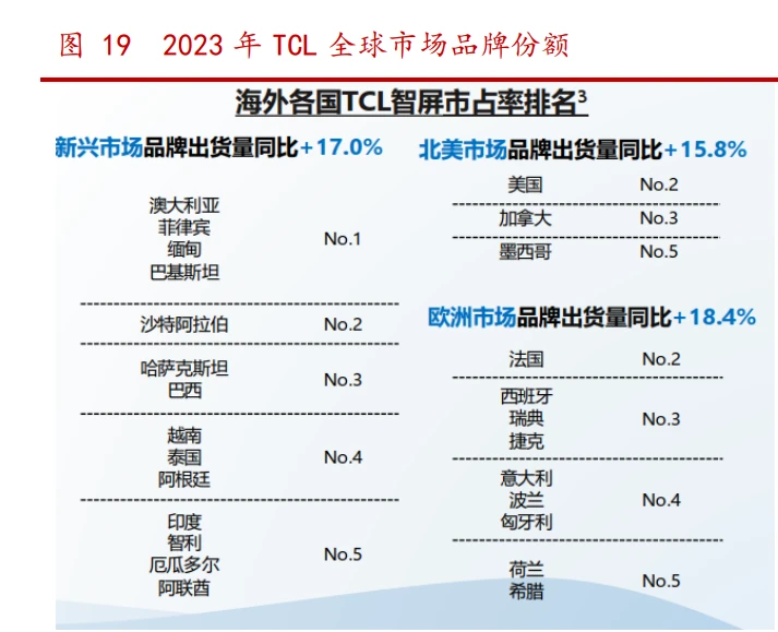 国内品牌已在部分市场实现份额领先,有望逐渐复制到其他市场。 海信视像:根据公司 2021 年年报,公司优化 GTM 组织,持续推动 IPMS 流程 改革,构建以消费者为中心的产品上市营销管理操盘管理体系,保障产品从定义、定 价、上市准备、推广、退市等产品全生命周期高效运转。根据公司 2022 年年报,中 国境外已开拓 250 余家海外重点渠道, 进一步拓展了 Best Buy、 Costco 等高端渠 道。根据 2023 年年报,2023 年公司在日本、 南非市场蝉联销量第一名,在澳大利 亚、欧洲部分地区市场连续位列销量 TOP5,我们认为海信品牌已经在部分地区建立 较强产品、品牌认可度。 TCL 电子:历时 9 年从北美销量第 9 升至美国第 2。以北美市场为例,根据 TCL 的 2019 年业绩推介材料,TCL 在 2017 年已打通了六大渠道最后一公里,进入 best buy 全美所有分店,后续持续推动本土营销策略和深化 Google 合作。从份额上看, TCL 在北美份额已从第 9 升至北美第 2。在法国、澳大利亚等市场,TCL 亦历时 8 年 实现 TOP2 销量。数字化转型网www.szhzxw.cn