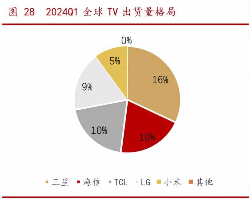 高端市场份额提升空间广阔。根据 OLED industry 和 IT 之家,24 年 Q1 全球出 货量前四名分别为三星、海信、TCL、LG,份额分别为16%、10%、10%和9%,此外,70 英寸以上大屏电视出货量同比大增 28%,其中三星电子以 22% 的市占率排 在第一;同期高端电视出货量中(2000 美元单价以上电视)中,仅三星、LG 占比就 达 60%,其中三星独占 42%。我们预计后续随着国产品牌高端电视销量的持续增长, 有望突破两大外资独大的格局。
