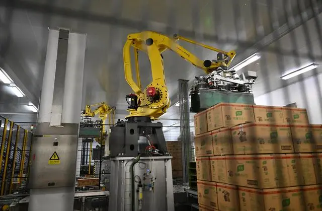 在联合利华天津食品工厂黑灯车间,码垛机器人在码放产品(5月11日摄)。