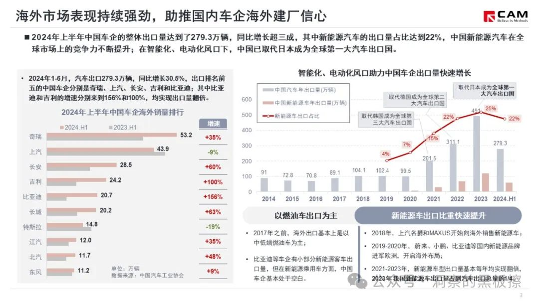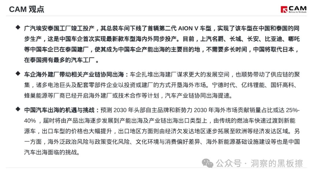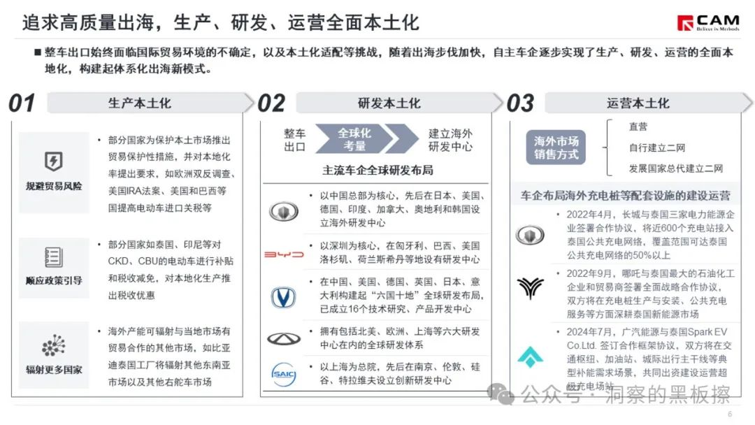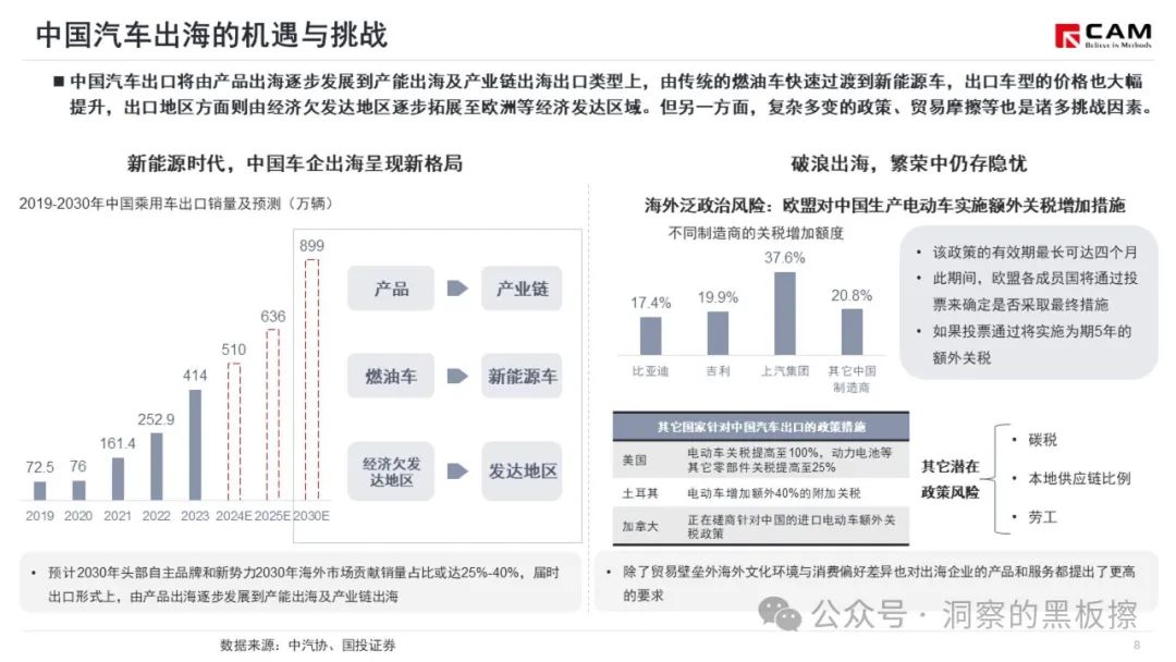 中国汽车出海的机遇与挑战:预测2030年头部自主品牌和新势力2030年海外市场贡献销量占比或达25%-40%,届时将由产品出海逐步发展到产能出海及产业链出海出口类型上,由传统的燃油车快速过渡到新能源车,出口车型的价格也大幅提升,出口地区方面则由经济欠发达地区逐步拓展至欧洲等经济发达区域。另一方面,海外泛政治风险与政策变化风险、文化环境与消费偏好差异、海外新能源基础设施建设等也是中国汽车出海面临的挑战。数字化转型网www.szhzxw.cn