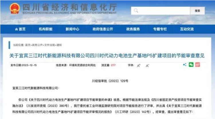 四川经信厅表示,根据节能法律法规及《四川省固定资产投资项目节能审查实施办法》(川发改环资规〔2023〕380号),其委托省工业环境监测研究院对项目节能报告进行了评审,并出具《关于宜宾三江时代新能源科技有限公司四川时代动力电池生产基地P5扩建项目节能评审情况的报告》(川工环研〔2023〕142号)。经审查,原则同意该项目节能报告。 数字化转型网(www.szhzxw.cn)