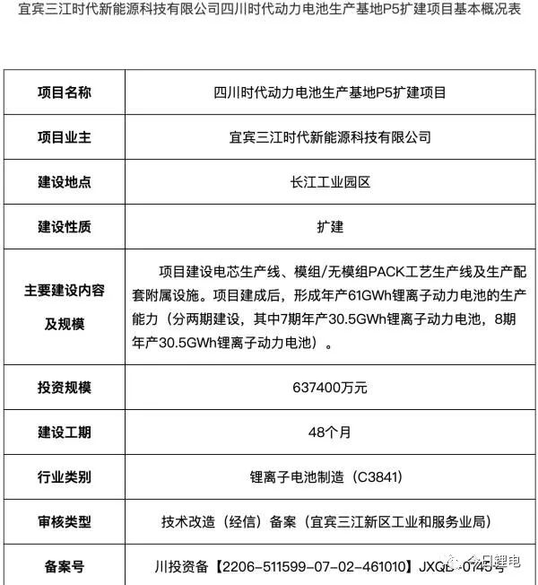 日前,四川经信厅发布关于宜宾三江时代新能源科技有限公司四川时代动力电池生产基地P5扩建项目的节能审查意见。文件显示,原则同意该项目节能报告。据了解,该项目总投资637400万元。项目建设电芯生产线、模组/无模组PACK工艺生产线及生产配套附属设施。项目建成后,形成年产61GWh锂离子动力电池的生产能力(分两期建设,其中7期年产30.5GWh锂离子动力电池,8期年产30.5GWh锂离子动力电池)。建设周期48个月。 数字化转型网(www.szhzxw.cn)