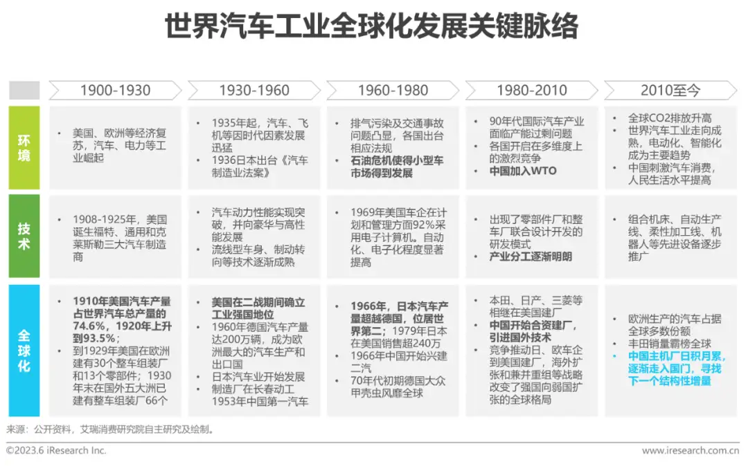 以史为镜:汽车工业发展的必由之路在汽车工业发展的必由之路上寻找发展中的结构性增量历史是过去传递到未来的回响。纵观全球汽车全球化道路,德国、美国和日本等国家的汽车产业均在全球化中处于前列,通过全球化扩张形成了如今的工业强国。反观中国,在智能化、电动化、研发/生产、产业链整合等方面已获得长足进展;以史为鉴,在国内汽车行业进入存量的背景下,自主品牌汽车出海将成为寻找中国汽车行业结构性增量的必由之路。数字化转型网www.szhzxw.cn