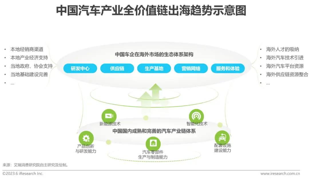 趋势三:中国汽车全生态出海图景初显国内汽车产业生态价值链体系成熟,为海外目标市场赋能近年来,在国家大力倡导和扶持新能源产业的背景下,车企纷纷加大对新能源汽车研发力度,使得汽车电动化、智能化、自动驾驶等技术在我国迅速铺展开来,发展进入快车道,形成完整的新能源汽车产业链;与此同时,部分传统自主车企在产品设计理念创新、核心技术自主研发、零部件生产、配套建设以及品牌运营等方面的能力均较以往大幅提升,推动中国汽车出海从整车、零部件的出口进入到汽车生产全价值链出海的新征程中。
