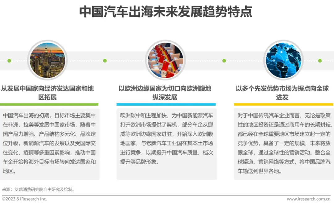 趋势:中国汽车出海已经完成早期的经验积累,在产品力、品牌力双向增强的推动下不断向高质量出海挺进,从车企的海外战略动向和市场表现看,向发达国家和地区迁移、向欧洲腹地纵深、以重点市场为据点向全球辐射扩散是最主要的趋势特点。未来,随着国内汽车价值链的成熟和完善,在海外资源的加持下,中国汽车海外生态价值链将不断被建构起来。