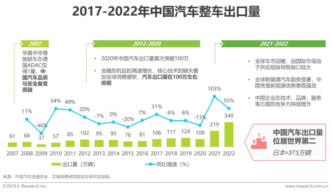 中国汽车出海-整车出口现状2022年我国整车出口量首次突破300万,位居世界第二数据显示,我国汽车近年来出口量不断增长,同比增速在2021年达到峰值,增长率为103%,汽车出口量首次突破200万台,2022年我国汽车出口量再次刷新纪录,突破300万台。我国汽车出口量近年来增势迅猛,除了国际汽车市场供应短缺之外,也与我国汽车企业不断提升汽车技术和产品实力有关,其中,我国新能源汽车技术和产品的不断迭代和推陈出新,成为核心驱动力之一。与汽车出口大国相比,我国汽车出口量位居第二,仅次于日本,可见我国的汽车出口地位已然抬升。数字化转型网www.szhzxw.cn