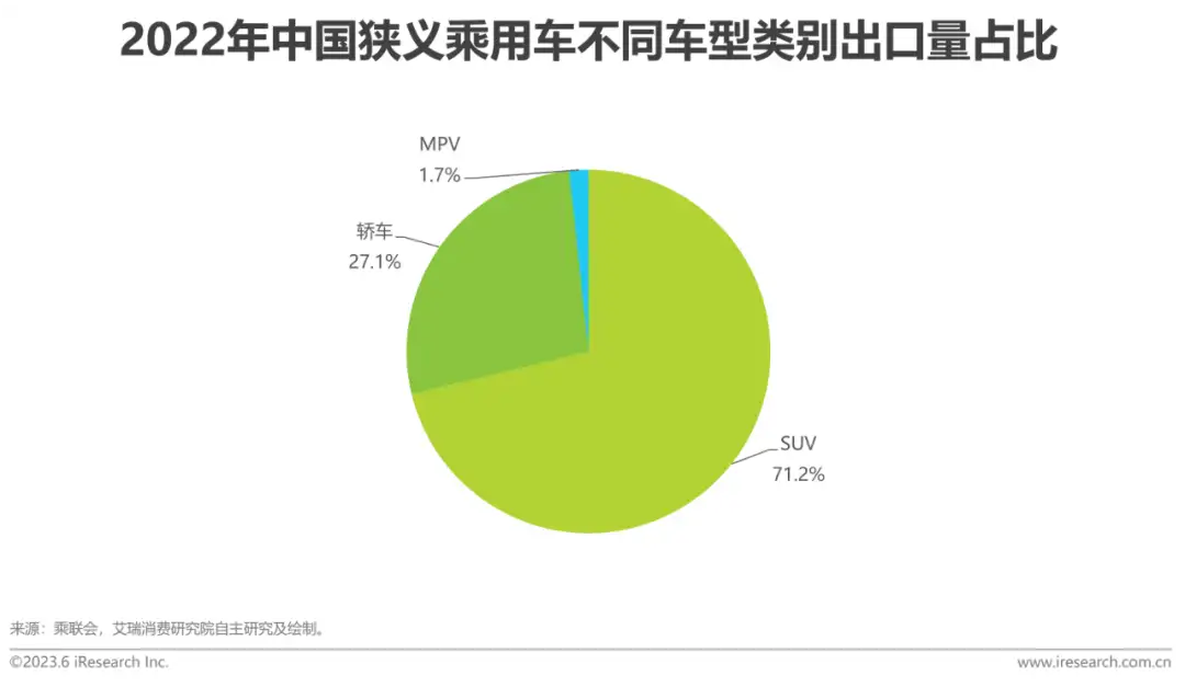 中国汽车出口产品特点——车型层面SUV成为我国乘用车出口的主力车型,销量占比达7成由于SUV空间大、乘坐体验舒适,适用于家庭出行、商务接送、日常通勤等多种场景,使得SUV不仅在国内畅销,也受到海外市场的欢迎。数据显示,在我国出口的乘用车车型中,SUV销量占比7成,其次是轿车,占比27%。从我国自主品牌出口车型销量TOP15来看,SUV占据了13席,轿车仅占3席。
