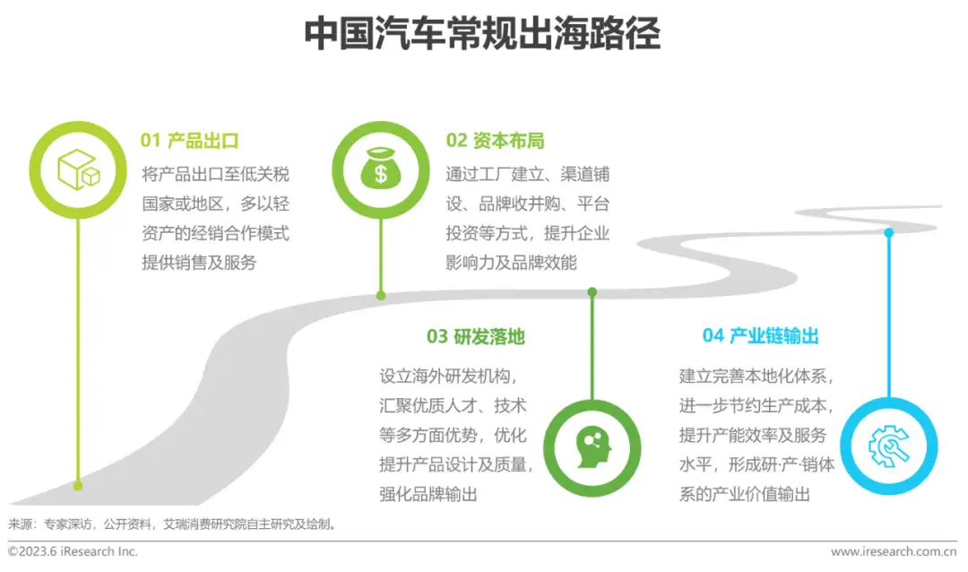 中国汽车出海的常规路径从产品出口到体系输出,是大多数车企常规的出海路径从产品出口,培育市场,到布局产业链,逐步提升整车及其零部件在海外生产的本土化率,形成规模,是大多数中国汽车企业进行海外市场拓展和开发的发展路径。目前,部分领先的厂商已在海外重点市场建立了比较完善的属地化研发、生产、销售中心,正从传统贸易模式向海外事业发展模式转型。数字化转型网www.szhzxw.cn