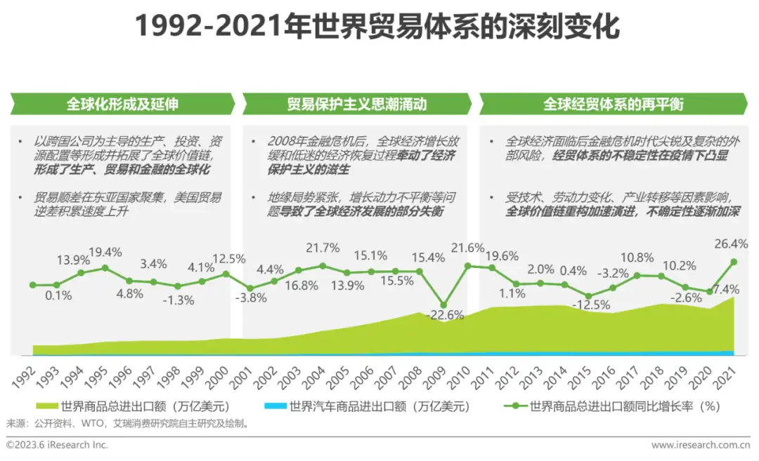 暗礁丛生:全球经贸体系的重新权衡把握时代机遇的同时,我国汽车工业必将面临的外部挑战2008年经济危机导致全球主要经济体遭受重创,并进入了所谓低增长、高风险的“新平庸”时期;同时自2008年以来,世界商品进出口波动愈加明显。世界经济与贸易在多维度、多重结构下的非均衡发展导致了生产要素流动和贸易过程中的不确定性,进而导致中国汽车工业在向外扩张过程中面临着保护主义、价值链内部化和地缘关系等重大挑战;同时,诸如新冠疫情的“黑天鹅”事件使挑战与不确定性持续加深,导致了中国汽车工业在迈向全球化道路上的暗礁丛生。数字化转型网www.szhzxw.cn