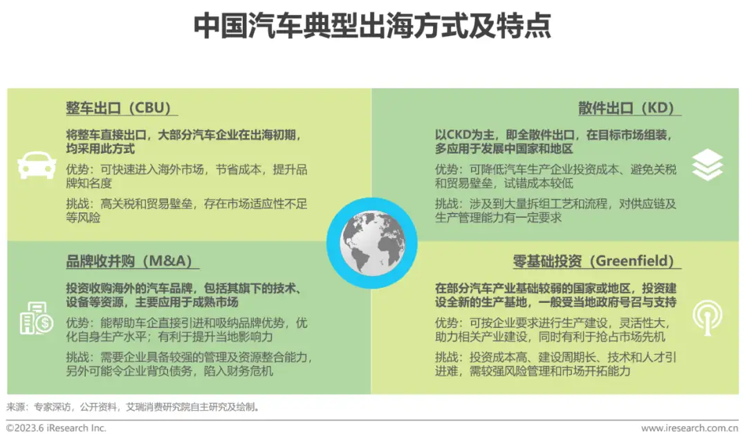 中国汽车的出海方式整车出口、散件出口、品牌收并购及零基础投资是典型方式CBU是指整车产品直接出口,此种方式能帮助企业快速切入海外市场;KD则是将汽车散件出口,在海外完成组装生产后再进行销售,能有效减少运输及关税成本;而海外品牌收并购,能够帮助车企直接引进和吸纳海外技术与人才,优化自身的生产水平,较快地提升海外影响力;此外,在部分汽车工业基础较差的国家或地区,具备实力的车企可在当地政府的引导下规划投建全新的生产基地,帮助当地进行产业建设的同时,有利于企业区域化的深耕及市场积累,实现双赢。