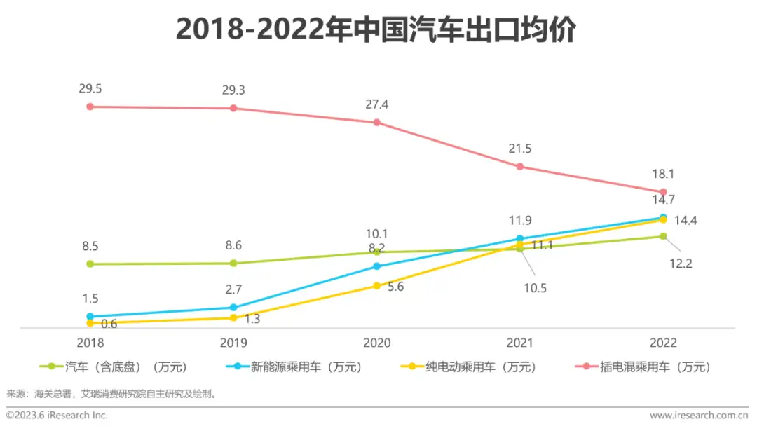 中国汽车出口产品特点——价格层面我国汽车出口均价稳步抬升,纯电车出海高端化趋势明显中国汽车出口除了数量增长迅猛外,汽车均价也在不断抬升,说明我国汽车在海外市场的消费档次逐渐提高。从海关总署的数据来看,我国整车出口均价近年来不断提升,2018年出口均价为8.5万元,2022年增长至12.2万元。随着中国车企在高端纯电乘用汽车领域的发力,驱动新能源汽车产品加快渗透海外市场。2020年开始,在纯电动乘用车的带动下,新能源汽车的出口均价一路走高,到2022年增长至14.7万元;插电混汽车出口均价开始走低。