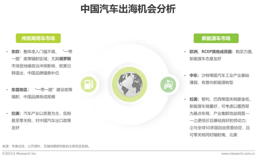 中国汽车出海的市场机会海外多地市场正处高增长红利期从整体市场看,2022年中国的汽车出口总体持续增长,2023年一季度同比增长54%,首超日本;在新能源汽车市场中, 纯电动车2022年出口增长约90%,2023年1~4月增长达160%,需求激增,市场潜力巨大;分国家及地区看,传统乘用车市场机会仍以东欧、亚非拉地区国家为主,新能源车的机会市场可锚定欧洲、中东及拉美地区。