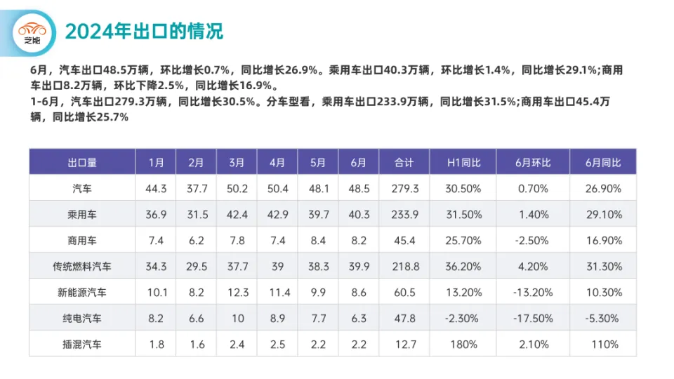● 1-6月,汽车出口279.3万辆,同比增长30.5%。乘用车出口233.9万辆,同比增长31.5%;商用车出口45.4万辆,同比增长25.7%数字化转型网www.szhzxw.cn