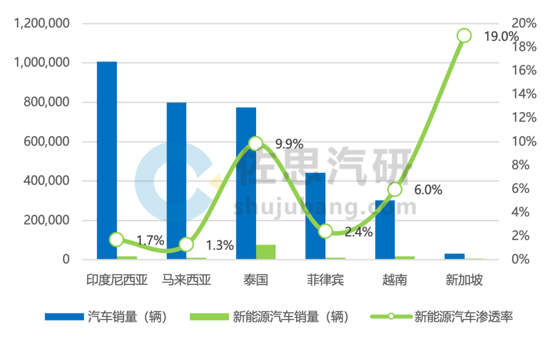 2023年东南亚主要国家汽车/新能源汽车销量及渗透率