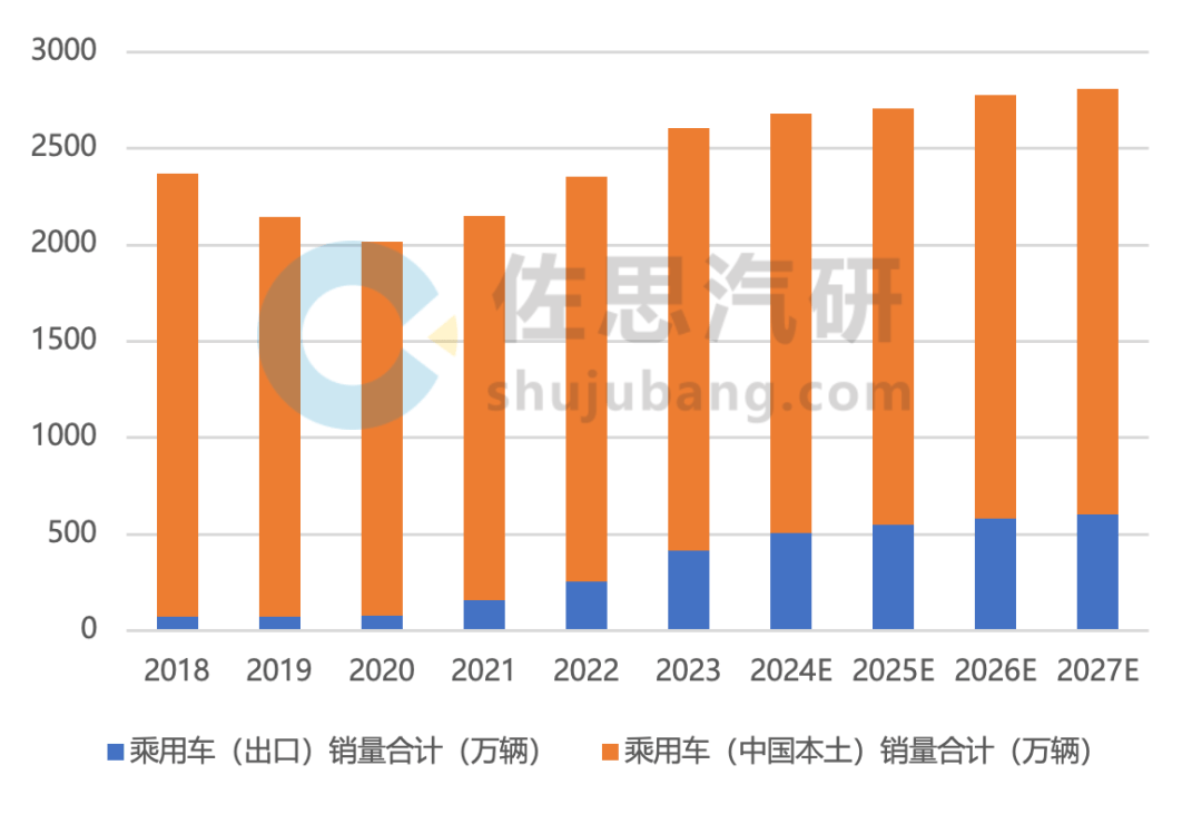 2023-2027年中国乘用车(中国本土+出口)销量预测