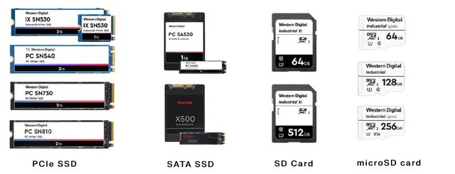 针对这些多样的需求,西部数据提供了可插拔存储产品和嵌入式存储产品,以为工业系统设计人员提供适用于工业级市场领域的解决方案,其中前者包括PCIeSSD、SATA协议SSD、SD卡和MicroSD卡几种产品形态,后者则主要包括eMMC产品和UFS产品两大类。