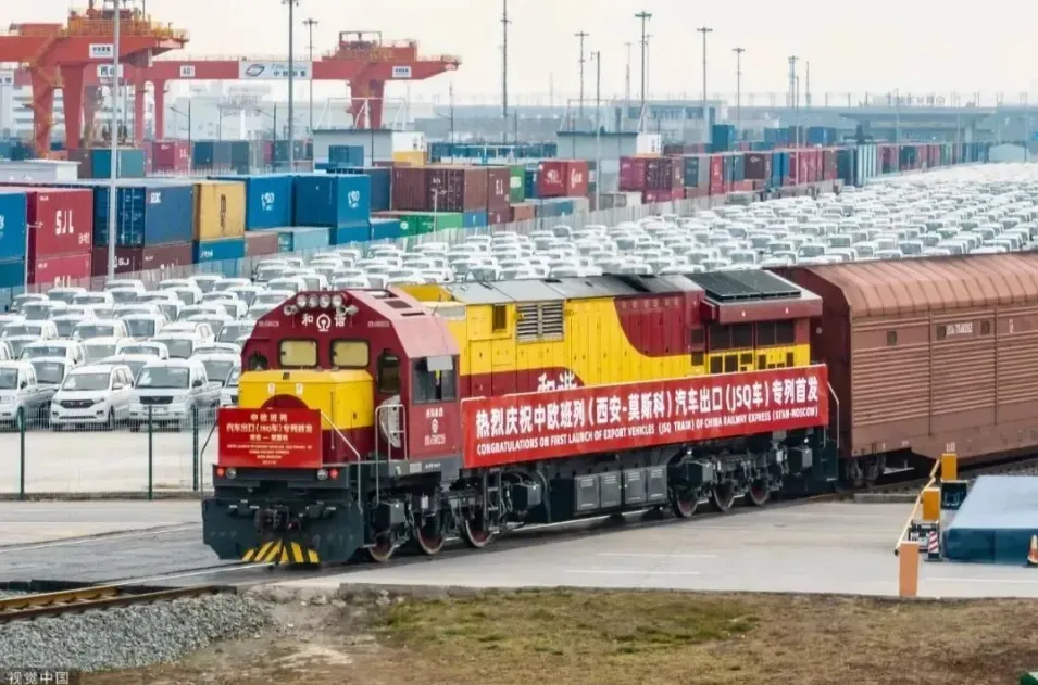 2023年1月16日,西安国际港站,满载261辆陕西制造汽车的X8256次中欧班列汽车出口专列发车驶向俄罗斯首都莫斯科/图源:视觉中国