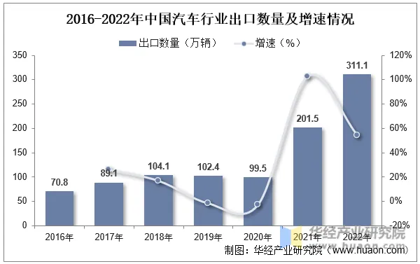2016-2022年中国汽车行业出口数量及增速情况/资料来源:中汽协,华经产业研究院整理