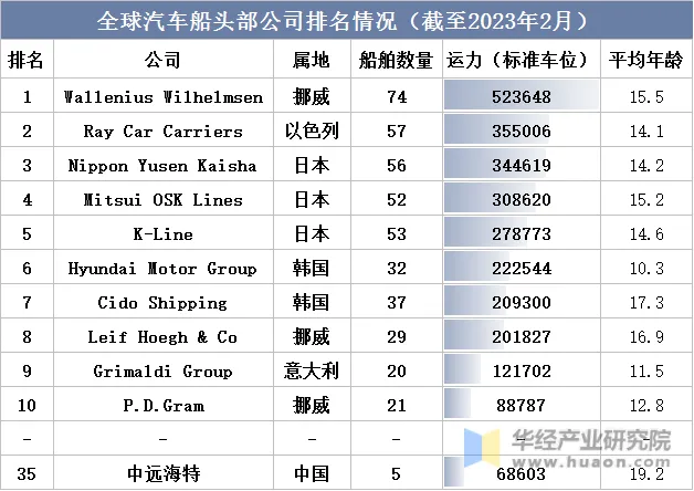 截至2023年2月,全球汽车船头部公司排名情况/图源:华经产业研究院
